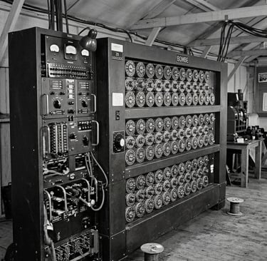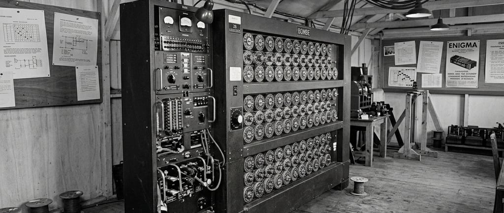 A "Bombe": Ele projetou uma máquina eletromecânica para testar milhares de combinações de chaves criptográficas muito mais rápido do que qualquer humano.